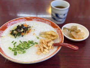 カウンターのおすすめ通りに裏へ。たっぷり具材のお粥に小籠包までついてた。これは朝に最高なセット。
