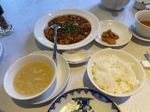 A海老とアスパラと黄韮の塩麹炒め、D新橋亭四川風麻婆豆腐