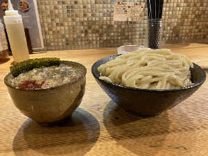 同系列の人気のつけ麺。うどん並の太麺を甘くてしょっぱい独特のつけ汁に浸す。腹持ちが良すぎて晩飯抜き