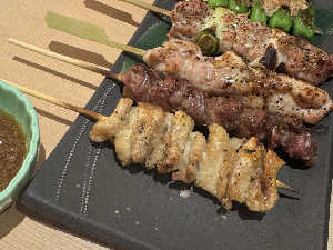 長野サーモン、大王イワナ、馬刺しにイナゴの佃煮を添えて。炭の香りで何を食べても美味しいお店