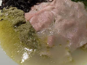濃厚な牡蠣の旨みが凝縮されたスープ、太縮れ麺に絡んで相乗効果で高め合う。牡蠣ペーストも混ぜて超美味。