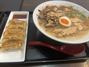 ニンニクの効いた豚骨ベースのラーメンとチャーシュー丼!濃いめの味付けがサウナ後にしみわたる。