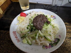 盛岡名物のじゃじゃ麺。ラー油がかなり辛いのでかけすぎ注意