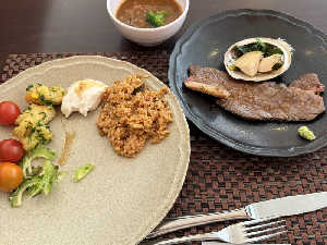 北谷町で打ち合わせ後瀬長島で知人に会う予定があり初の昼食ブッフェ✨牛ステーキ美味👍
