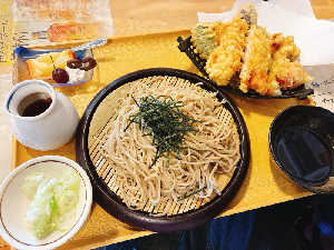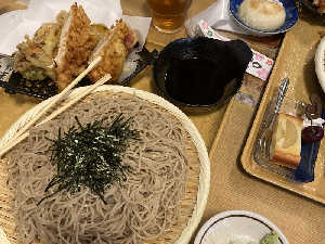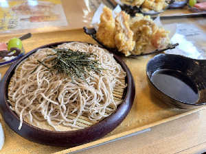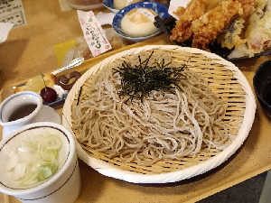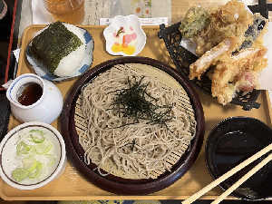 大ざる(300g)&天ぷら盛り合わせ小のセット(デザート付)。 信州来たなら蕎麦食べなくちゃね!
