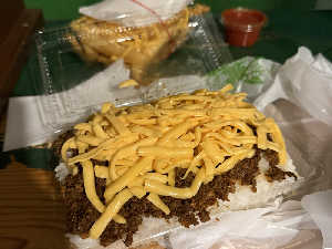 ピリ辛タコソースでとても美味しい。 なかなかのボリュームで持ち帰り用トレイに収まってないのもまた良い