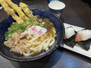 肉ごぼ天うどん久しぶりに食べた😭💕飛行機の時間が迫ってたので急いで食べた