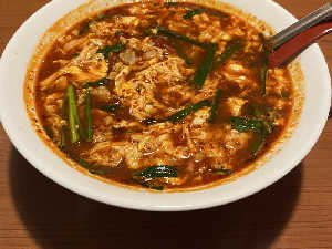 辛旨。5辛にしたが、それほど辛くは無い、スッキリ辛旨。ニラとニンニク溶き卵がアクセント❗️