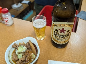 三点盛りにスズキがサービス。サッポロラガー赤星大瓶が390円はもはやバグ。