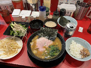 濃厚な家系ラーメン! 麺の硬さと味の濃さと油の量を選べる! 初心者🔰には味はうすめがおすすめ!