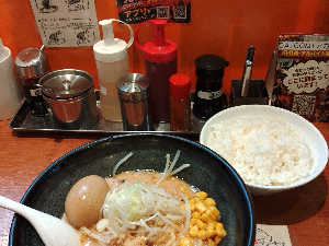 丁度いいコッテリ感、サービスのニンニク辛味噌、丸ごとニンニク、生姜で味変も旨し。