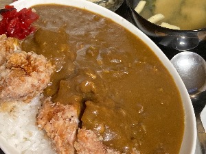 大きなからあげを余裕で受け止めるカレーの包容力。脇を固める味噌汁とサラダ。美味すぎるッ( ´▽`)