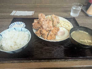 つけ合わせの半熟目玉焼きで目玉焼き丼も楽しめる。揚げたての唐揚げの美味さといったらもうタイヘンです。