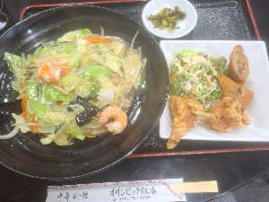 唐揚げに 春巻きとあつあつの餡掛け。 値段は1350円ですが、ボリュームや具だくさんなので良い。