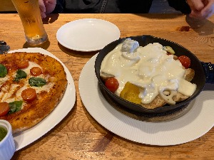 施設内で育てたお野菜たっぷり、しかもグリルの具合が絶妙でおいしい! お肉も◎ピザもぺろりでした!