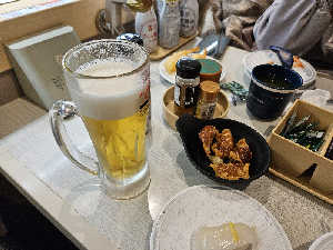 ミニジョッキ、茶碗蒸し、サーモン三種、とろたくユッケ、ミニラーメン食べて1300円。安すぎて驚愕🫨