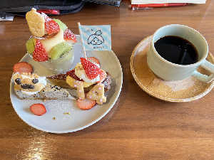 開店14周年記念のおやつプレート 小さなプリンアラモードに ケーキを2個ついてくる 朝から贅沢三昧