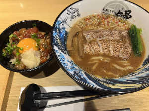 スープ一口目からマグロ出汁の風味が感じられ、炙られたマグロチャーシューは柔らかくて美味!