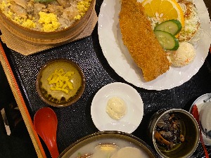 アジフライは美味。貝汁はアサリに に砂が入ってたけど身は大きく汁は美味い。