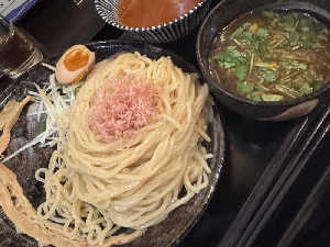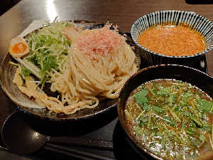 辛いのとノーマルと2種類のつけ汁。長いメンマが面白い。カツオの風味が良き🐟