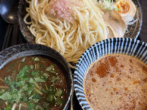 スープが2種類もついてくるお得なつけ麺。麺量もデフォで400gあるので交互に食べ進められます。