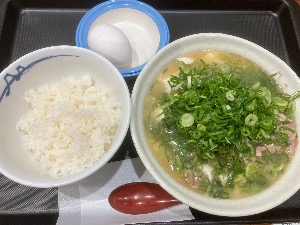 期間限定の豆腐とお肉と玉ねぎたっぷりの大阪名物肉吸いを生卵付きでトレーニーサ飯として。