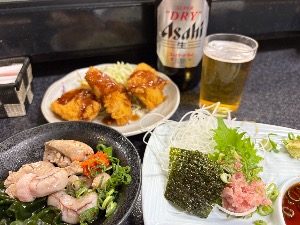 生レバ・つぶ貝造り・イワシ天&大瓶