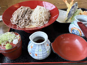 「田舎蕎麦」と「更科蕎麦」の合い盛。田舎蕎麦のほうが好み。海老天丼も美味でした🦐