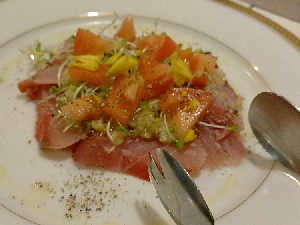 酸味のあるミニトマトのソースで豚肉がさっぱり食べられて日本酒にも合う。
