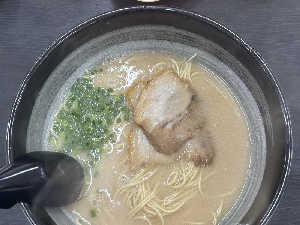 細麺の豚骨ラーメン、高菜やキャベツの千切りはサービス。スープはコッテリとあっさりの中間で美味しかった