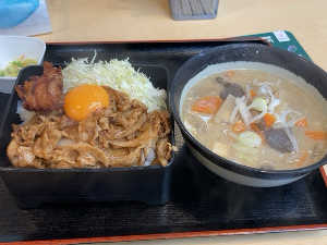 彦根トラステの宿泊朝食で選べる定食のひとつ。サービスで豚汁にしてくれたから、ニンニク🧄豚汁にした🐷