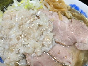 手打ち縮れ麺はモチモチで美味しい。 無料トッピングの脂身は甘くて、スパイシーな味噌スープと相性抜群