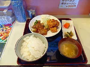 サクサクの鶏カラとバーロ(豚肉ニンニクで味付けした炒め物)でご飯が進みます。