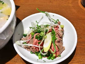 グリーンサラダは別注文。スープとザーサイは忘れられて後からもらい、写真なし。ザーサイにはアサリ入り