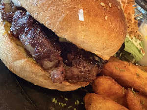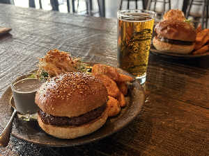 肉食べてる感のあるハンバガー デザートの黒ゴマプリンも美味しいかった ノンアルコールビールに合う