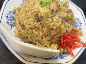 噂通り温かい冷やし中華。上には挽肉入り野菜炒め、麺はワカメ練り込み?の緑色。実に面白い、そしてうまい
