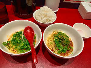 くにまつと武蔵坊の汁無坦々麺を同時に頂けるという夢のメニュー。テイストが異なりとても美味しかった