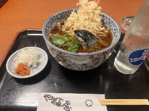 宮澤賢治が愛した、やぶ屋の天ぷら蕎麦と三ツ矢サイダーのセット。味覚からも賢治の息吹を感じる。