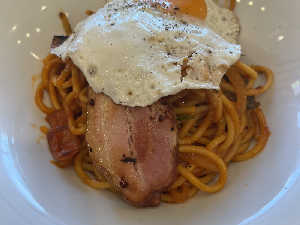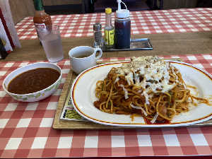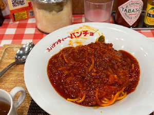 →ミート➕ナポリタンのマリアージュ♪味が濃すぎて最後ギリギリでした💦 →粉チーズ🧀もかけ放題でカオス