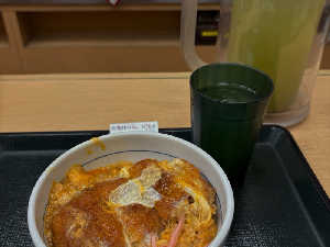 ご飯は小盛り🍚安定のなか卯🐇🟡 山椒と七味と紅生姜をお供に食べるカツ丼もよき🧡冷たいお茶もおいしい🍵
