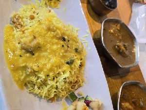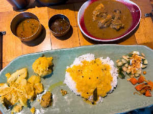 南インドの定食ミールスを出してくれる。チキン🐓、野菜🥦、ラム🐏。プレートの上で色々まぜる。美味🤤
