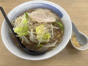熊さんの二郎系、写真と別物。 背脂ニンニク野菜醤油ラーメンだった。 残念。