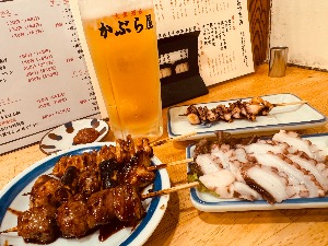 滞在20分でビール、レモンサワー、串2本、黒おでん4品、コロッケ、じゃがバタキメた 笑