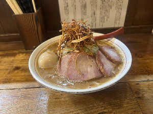 ごぼうの素揚げ、スモーキーな焼豚、極太ちぢれ自家製麺、スープのコク・・旨みしかない・・リピ確 🐷