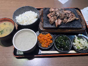ご飯、味噌汁、わかめナムルや肉しぐれ、ガーリックライスボール、付きで880円 コスパ最強🤤