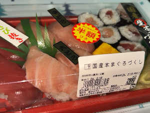 サウナ終わりの19:30ごろ来店すると刺身や寿司、弁当などが半額になっている。