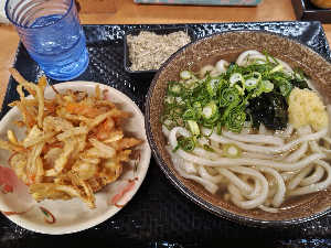 シコケンさん横。デカいかき揚げに無料のワカメとネギをタップリと。讃岐うどん最高でもうこれで満腹です。