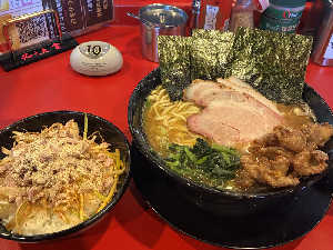 家系ラーメンにホルモン揚げ追加とライスに無限ニンニクを乗せて食べるとめっちゃ旨い😋