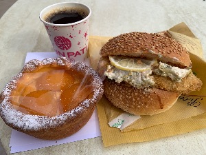 あんずタルト🥮、肉厚マトウダイのフライバーガー🍔、無料コーヒー☕️。美味しかったです。