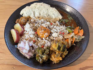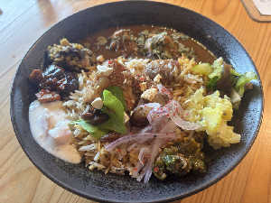 いりこ出汁のチキンカレーとアスパラともろみのキーマカレーのあいがけ
